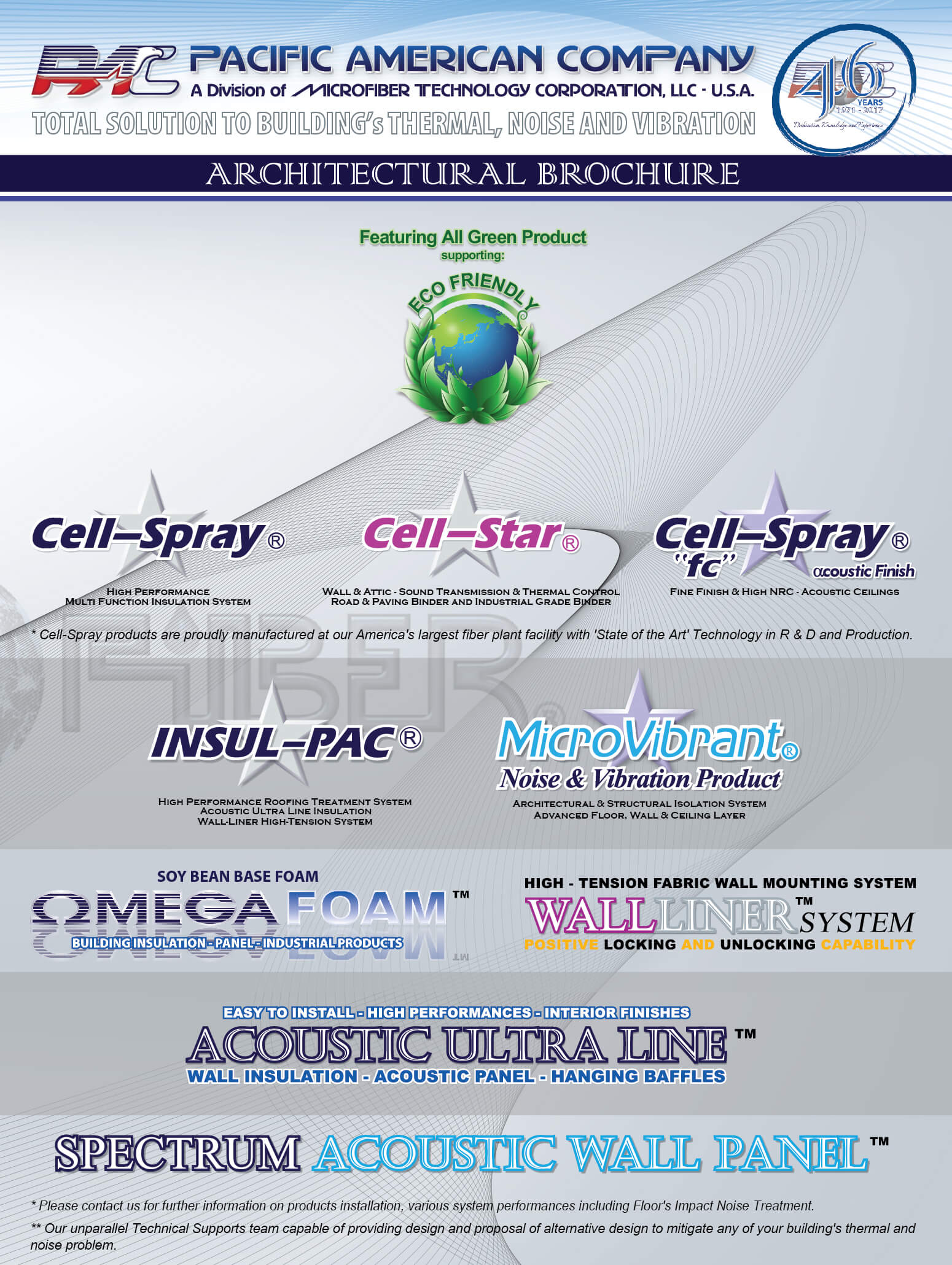 Produk kami didesain untuk menciptakan ruang akustik yang nyaman sehingga dapat menjalankan fungsinya dengan optimum. Orang dapat mendengar setiap kata dari pembicara maupun musik dengan sangat jelas dan sebagai hasilnya produktivitas dapat ditingkatkan. Selain sebagai materi peredam suara, produk kami juga berfungsi sebagai peredam panas ketika diaplikasikan di atap. Keuntungan lainnya adalah produk kami tidak beracun dan aman bagi kesehatan; kami telah menerima sertifikat dari US-EPA sebagai Energy Saving & Environmentally Friendly Product.